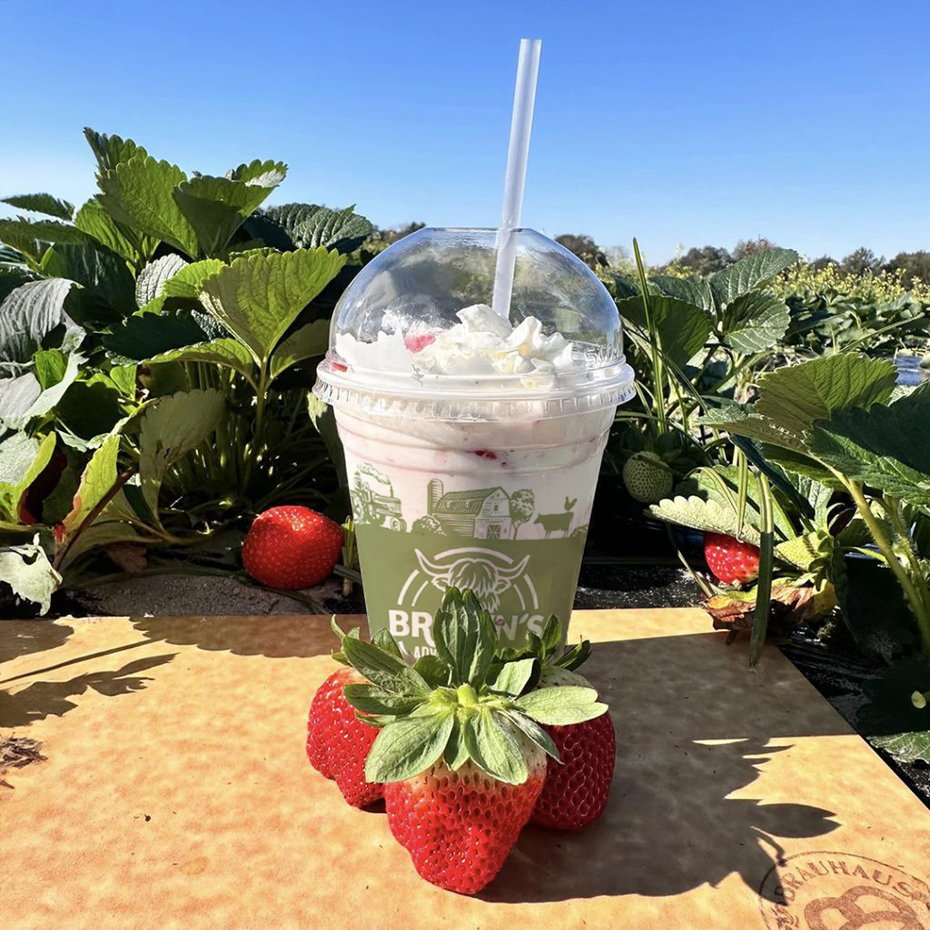 Hand‑spun Strawberry Milkshakes made with farm berries & whipped cream!